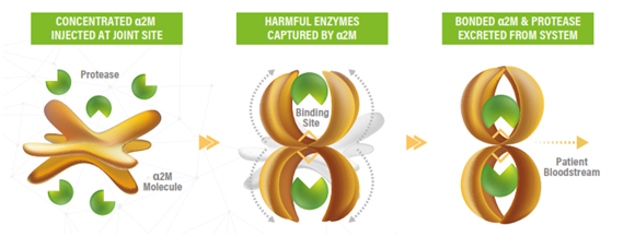 Once in a joint, A2M grabs and disables inflammatory proteins called proteases reducing inflammation as well as inhibiting matrix metalloproteinases and other enzymes responsible for cartilage degradation. A2M inhibits cytokines responsible for inflammation. A2M also up-regulates the genes responsible for building up the joint and down-regulates genes responsible for breaking down joints.