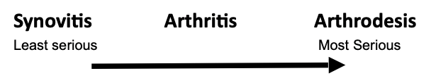 The next stage is arthritis, where little spurs can be seen on x-rays. On arthroscopy you find cartilage defects and spur formation. The final stage is arthrodesis which means the arthritis is so severe that the joint fuses.
